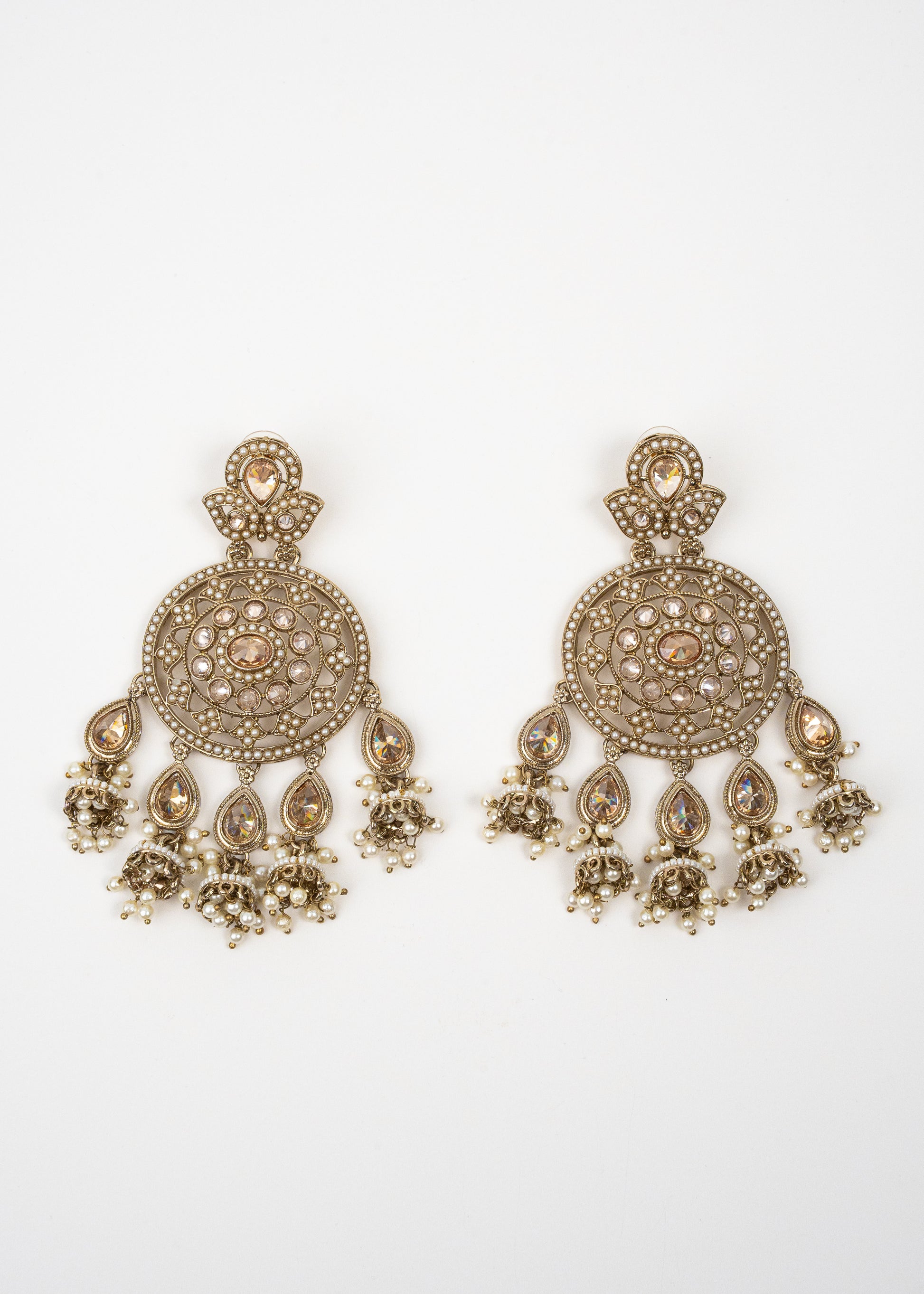 An eternal classic, these polki earrings with pearl-like drops embody grace and tradition. Crafted with fine detailing in antique gold, they add elegance to sarees, lehengas, and even Indo-western styles. A versatile accessory that transitions seamlessly from festive occasions to wedding ceremonies.