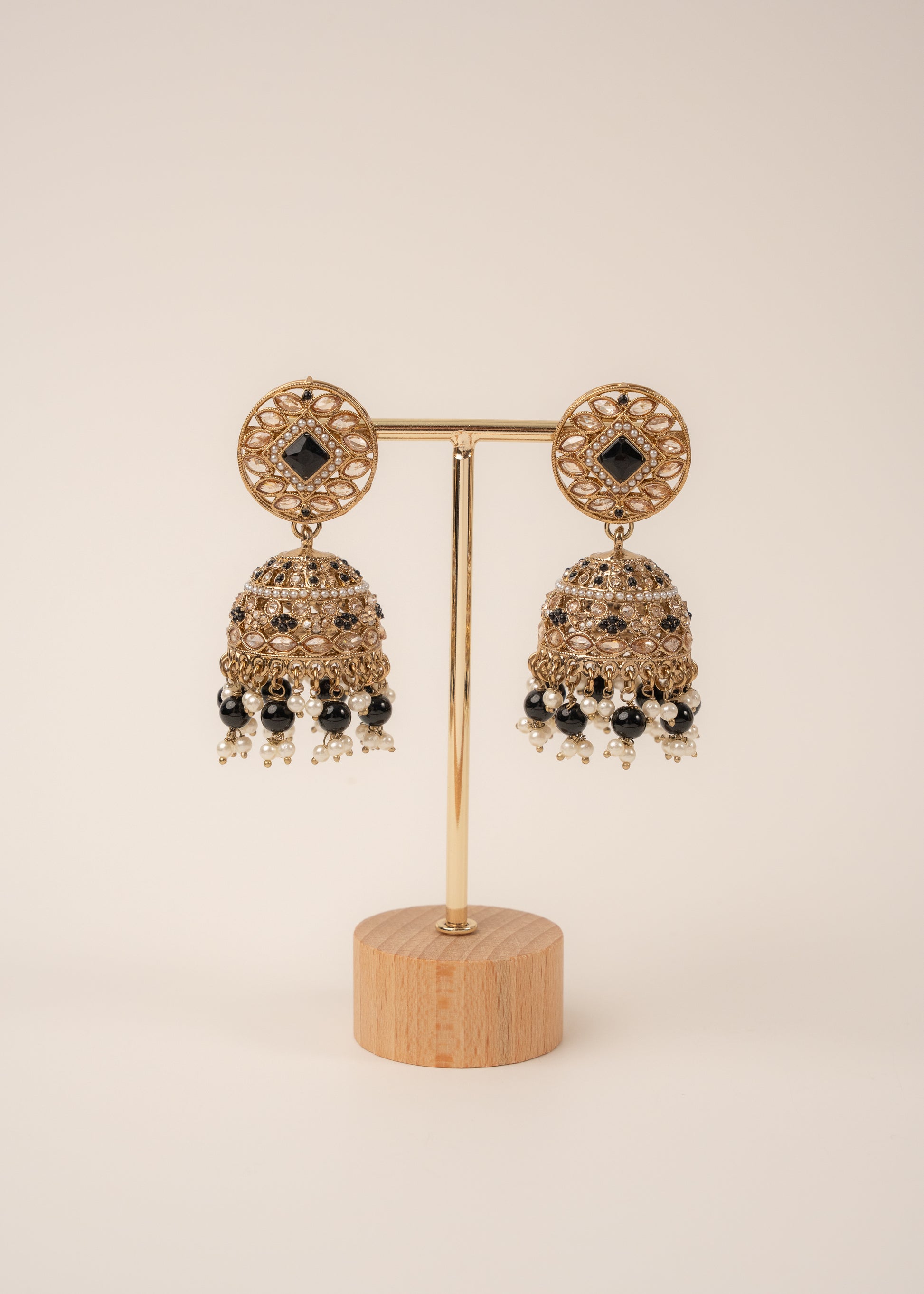 Antique gold with black pearl bead drops – a bold yet elegant combination. Perfect for creating a striking statement look for evening weddings.