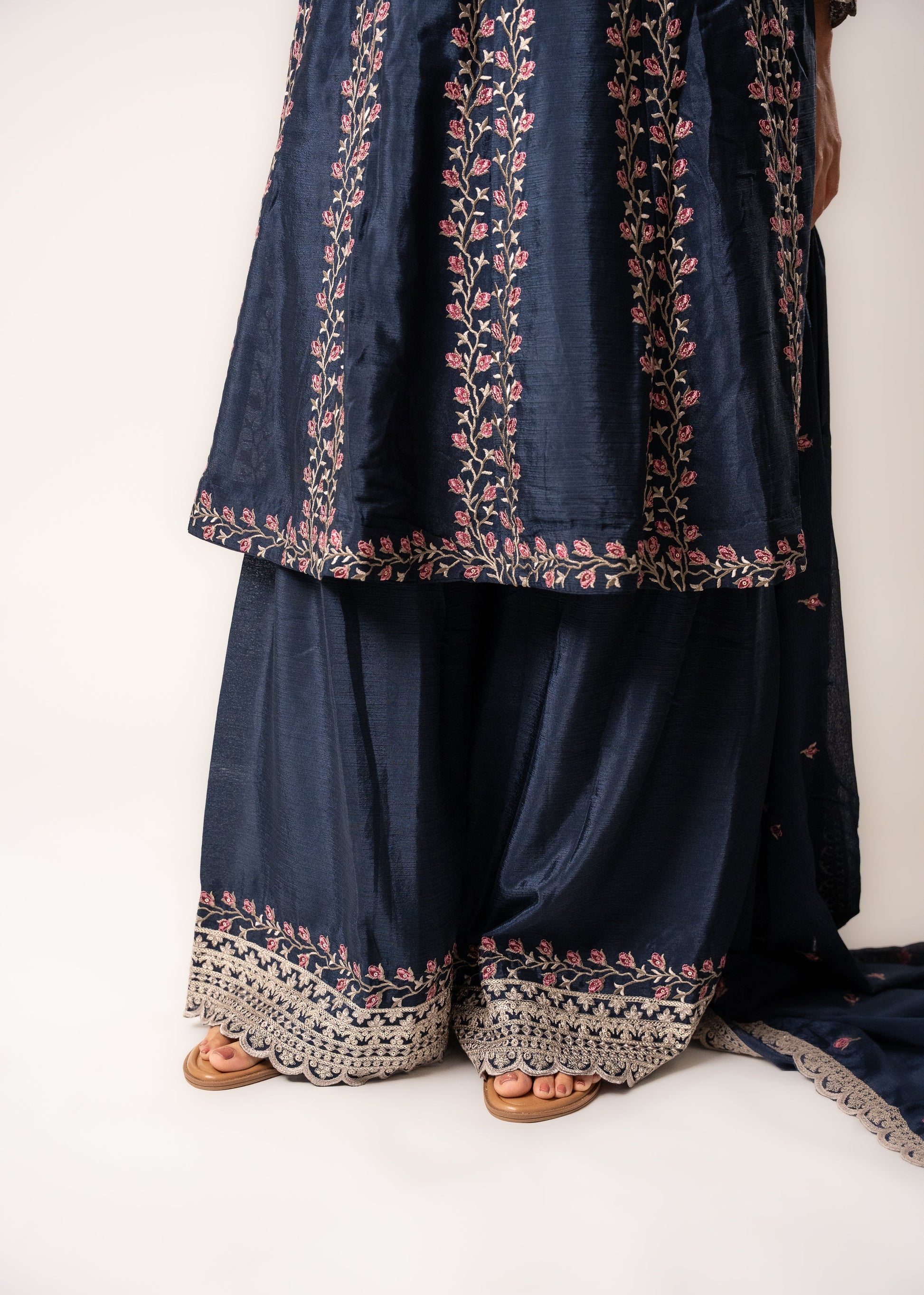 Step into elegance with this navy blue embroidered suit set. The kurta is adorned with intricate thread embroidery, paired with flared palazzos and a matching embroidered dupatta. This regal outfit is perfect for weddings, festive occasions, or evening functions, offering a graceful traditional look.