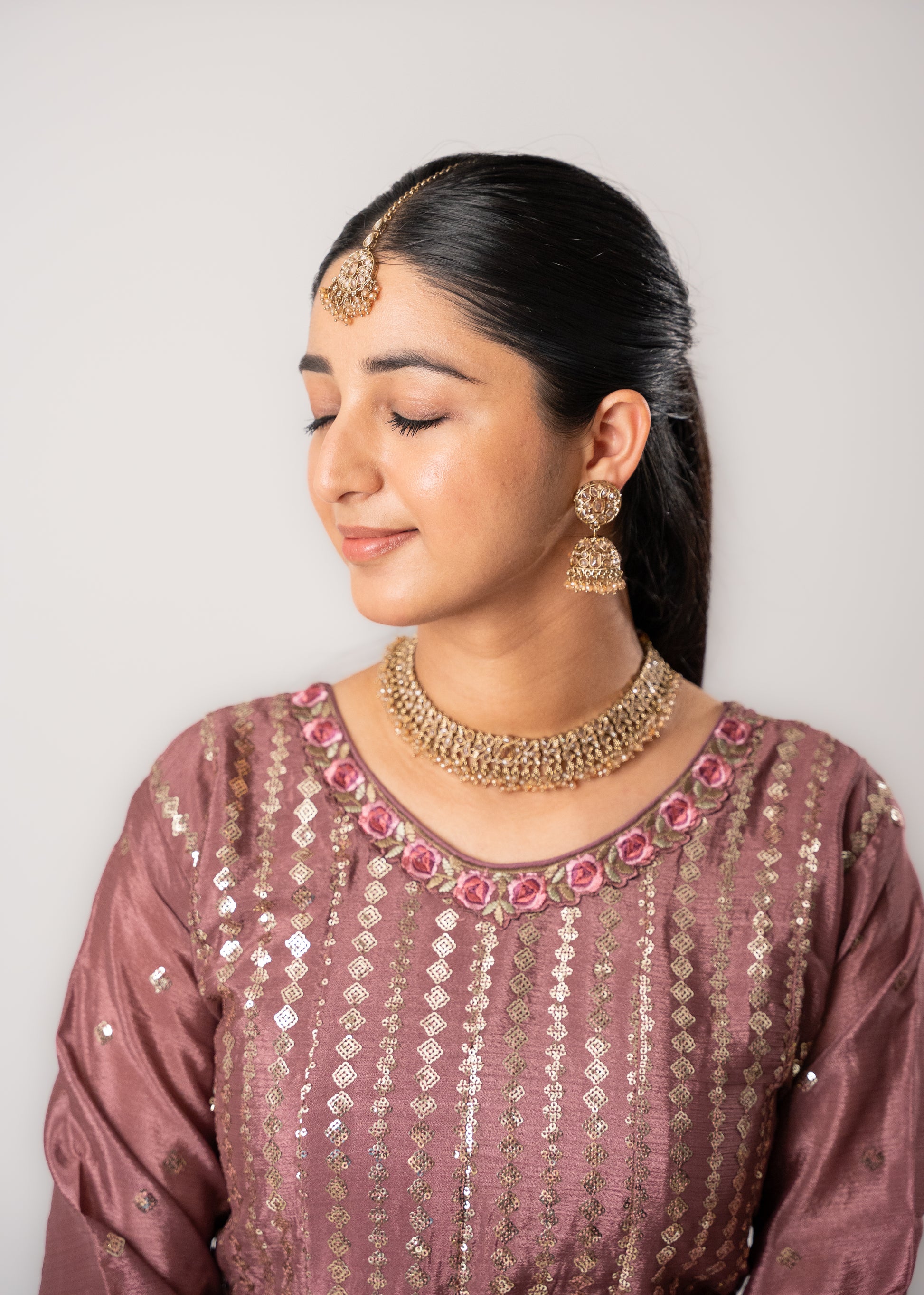 A statement-making Muted Mauve Pink Gharara suit embellished with sequins, blending modern sparkle with traditional grace. Perfect for wedding functions and evening festivities.