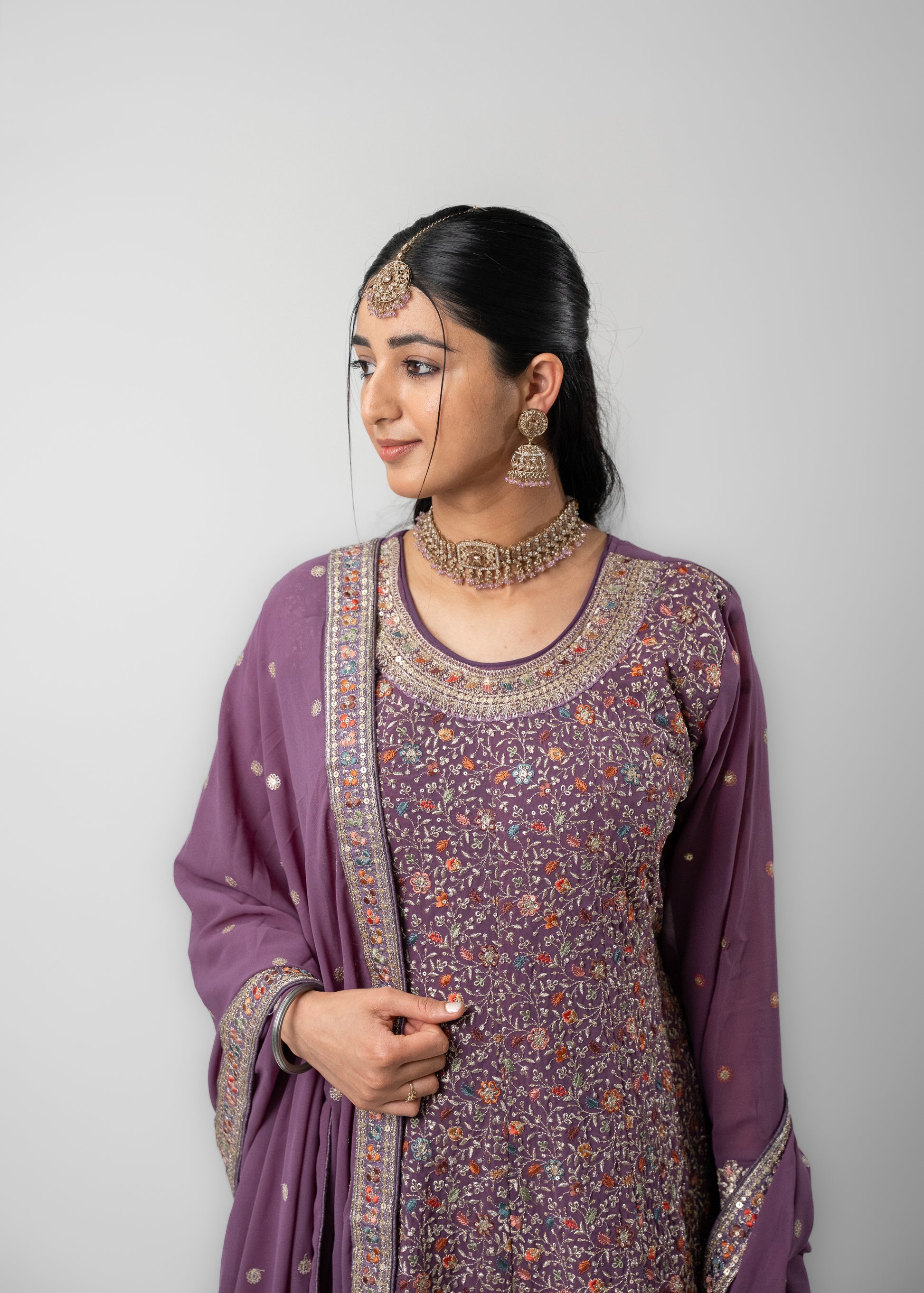 A luxurious plum suit adorned with intricate embroidery in multi-hued threads. Paired with a wide palazzo and a sheer embroidered dupatta, this piece blends tradition with modern sophistication.